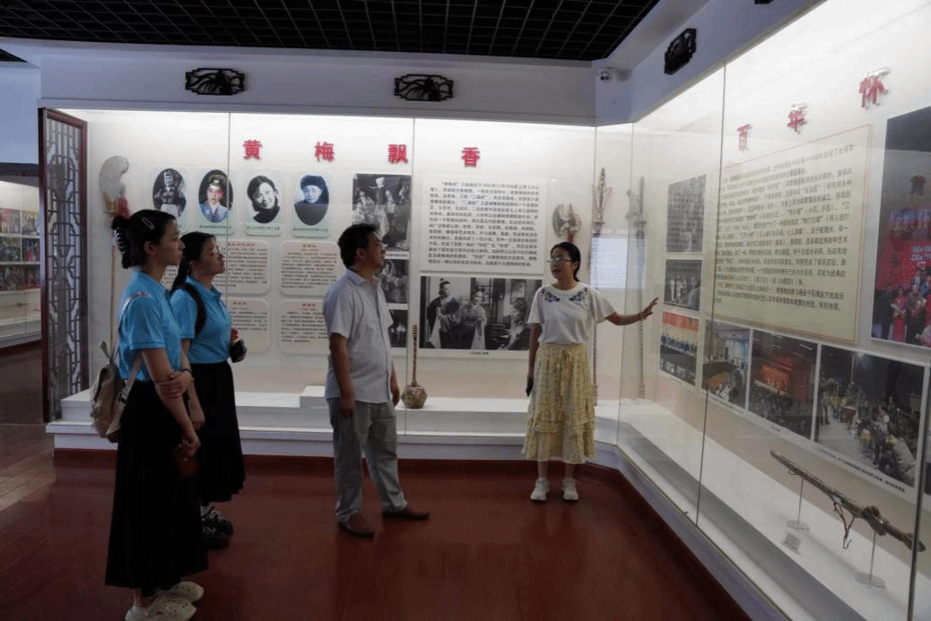 团队成员还到徽班博物馆临时展馆作了调研。这个临时展馆虽然简陋,但内容却十分丰富。不仅有着京剧艺人们的轶事,还有很多新奇的戏曲知识,如石牌戏班的祭猖与扫合习俗、移民对石牌文化的影响等。展板上一句顺口溜:“三庆的轴子、四喜的曲子、和春的把子、春台的孩子”,体现了四大徽班各自的特色。二楼的主展厅中有一张引人注目的照片,解说员说,这是2015年5月10日,时任中央政治局委员、中央书记处书记、中宣部部长刘奇葆到石牌考察时的照片。刘奇葆在考察石牌时说:“曹禺先生来朝圣,我们今天来寻根。”