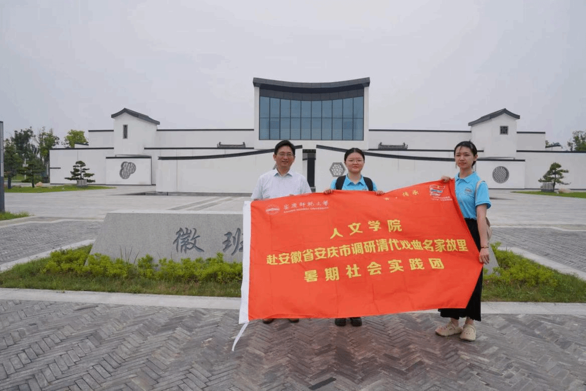 为了更好地了解安庆清代戏曲名家的活动情况,7月14日,beat365平台官方网站“青·传承”调研戏曲名家故里暑期社会实践团队的成员在指导老师叶当前教授的带领下,前往安庆市怀宁县石牌镇进行实地考察。团队成员先后考察了徽班博物馆的新旧两个展馆,在石牌老街探访了老一辈戏剧盔帽制作手艺人,了解了石牌戏剧小镇的规划及建设情况。