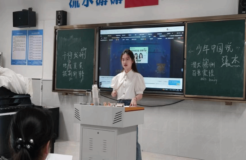 在课程的开展过程中,团队成员创新课程方式,发挥个人风格,将普通话推广与音乐、书法等课程结合起来。多领域开展与小学生的思维交流。团队成员史欣瑶、楼丝雨带着音乐课的学生学习《少年中国说》的歌词,向小朋友们讲述了梁启超的创作历史,将百年诗词与现代音乐结合,从读音到演唱让孩子们深入浅出掌握字词发音。团队成员产恬恬在书法教室带着小朋友用毛笔书写《赋得古原草送别》和《静夜思》,将中国传统文化与现代汉语结合起来,将汉语言文学专业专业特色与推广普通话相结合,走出团队特色的乡村普通话推广之路,助力乡村教育振兴。