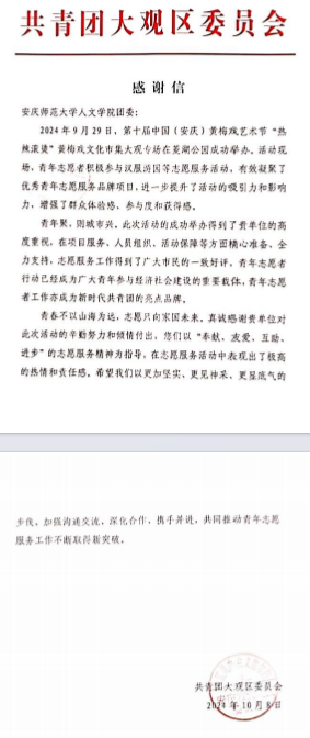 近日,大观区团委致函beat365平台官方网站,对beat365官网青年学生在第十届中国(安庆)黄梅戏艺术节“热辣滚烫”黄梅戏文化市集活动中的志愿服务工作表示赞扬与感谢。