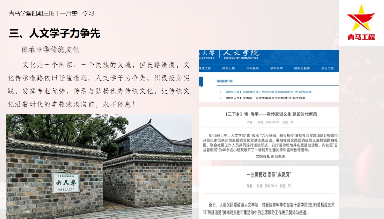 会议强调,一是要理解好中华民族讲求礼让、以和为贵传统美德的六尺巷文化,把“和为贵”的优秀传统文化融入日常生活、为人处世的方方面面,在新时代的优秀传统文化中汲取新智慧、解决新问题; 二是在维护优秀传统文化的道路上,推动优秀传统文化的创造性转化、创新性发展,使中华优秀传统文化与人文学子无限的想象力、创造力结合,使传统文化“火起来”“潮起来”“动起来”;三是要以马克思主义为指导,理解科技创新强国的重要意义,在扎实掌握专业知识基础上,进行跨学科交流。不论是继续发扬优秀传统文化的创造性转化、创新性发展,还是探索新时代中国特色社会主义事业的创新发展,都应做创新强国道路上的生力军;四是要将所学的知识回馈社会,并深入基层多了解广大人民群众的需求和要求,为以人民利益为核心的社会主义事业做出人文学子的青春贡献。