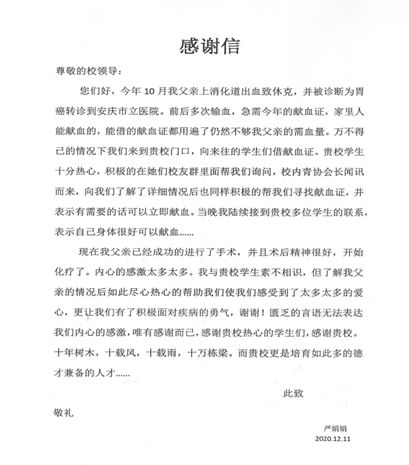 “我与贵校学生素不相识,但了解我父亲的情况后如此尽心热心的帮助我们使我们感受到了太多太多的爱心,更让我们有了积极面对疾病的勇气……”12月11日,beat365平台官方网站团委收到了一封感谢信。信中,严娟娟女士向人文学子热心无私、乐于助人的奉献精神和行为表示了衷心感谢。同时,严女士也赞扬了beat365平台官方网站教育理念和教育成果,字里行间都流露着她的深切谢意。