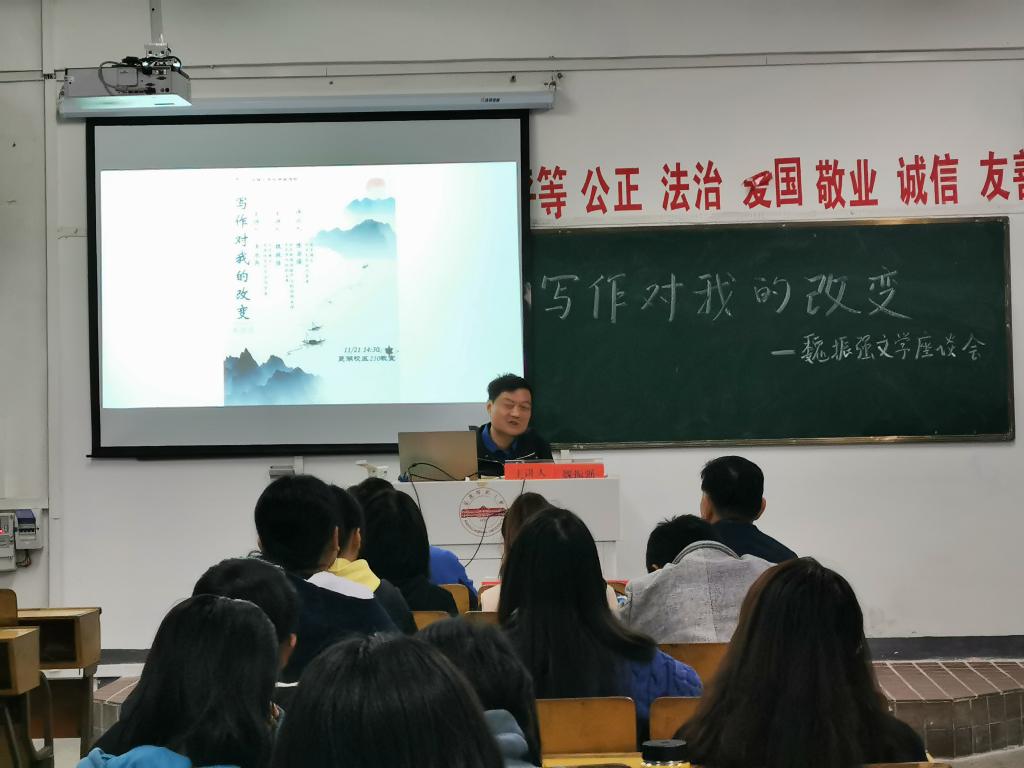 11月21日下午,安庆新闻传媒中心副刊部主任、安庆市作协副主席魏振强应邀来到我校开展了一场题为“写作对我的改变”的文学讲座,讲授自身创作经历。本次讲座由白鲸文学社主办,本社指导老师王永兵、陈宗俊分别担任主持人、评议人,beat365平台官方网站江飞教授、叶当前教授担任嘉宾,四十余名师生参加了活动。