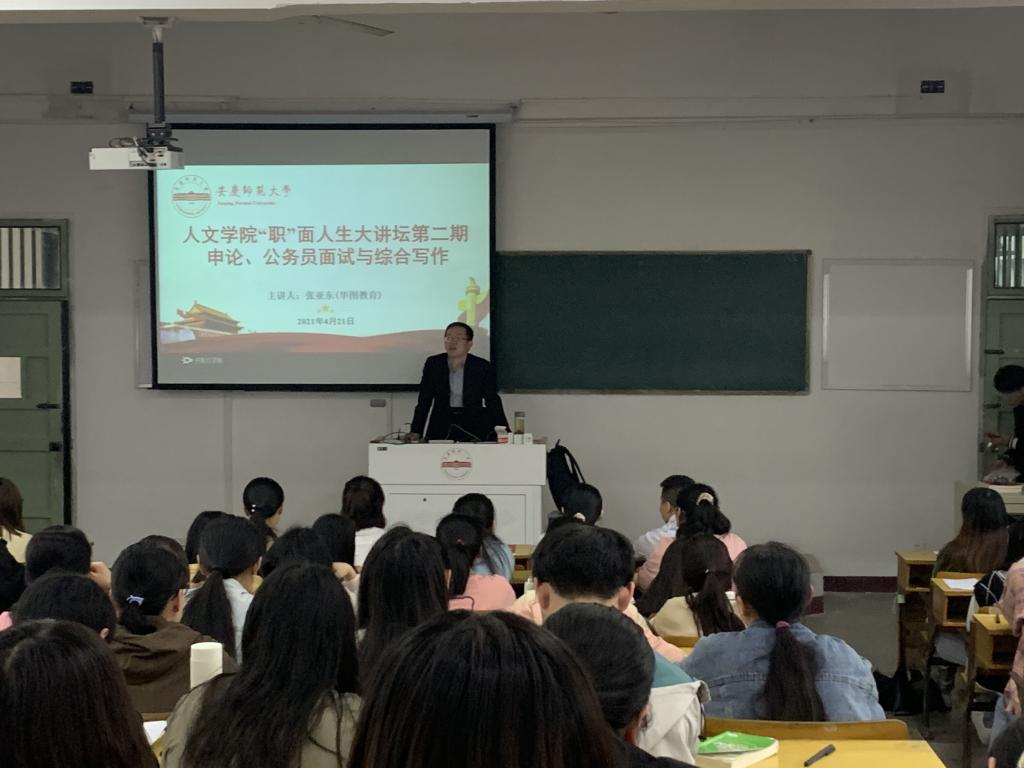 4月21日下午,beat365平台官方网站“职”面人生大讲坛第二期——“申论、公务员面试与综合写作”在教学楼214教室举行。华图教育专职老师张亚东受邀担任主讲,beat365平台官方网站各专业本科生一百余名学生参加讲座。