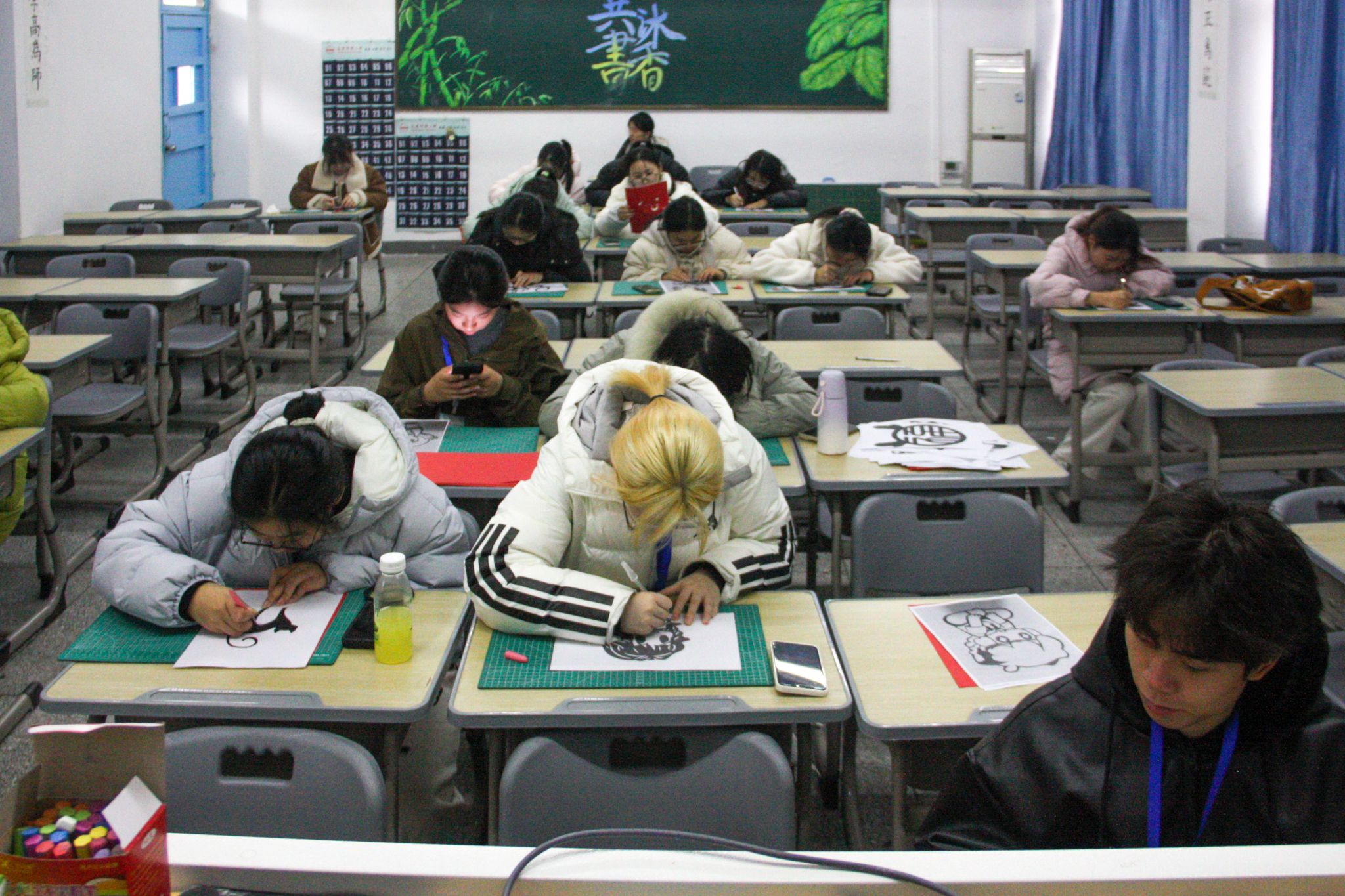 “起刀和收刀时要轻,中间走刀时保持均匀。”2024级汉语言文学专业(4)班毕馨纯作为纸雕俱乐部骨干成员对初次接触纸雕的学子讲解技法要领,手把手示范操作细节。现场学子认真学习实践,经过精心雕琢,三十余幅主题鲜明、纹理细腻的纸雕作品新鲜出炉。