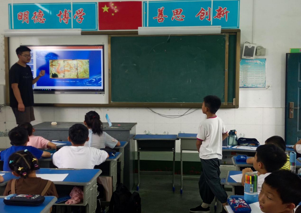 著名的艺术教育家丰子恺先生曾说过:“能用作画一般的心来处理生活、对付人生,则生活美化、世界和平。”审美教育是以艺术的形式,通过审美活动潜移默化地优化人的心理结构,铸造完美人性,提升人生境界。在7月3日的课堂上,团队中的尹彪同学,通过精心准备的中国美术史知识,图文并茂地向小朋友们介绍了中国美术知识。令人眼花缭乱的青铜艺术、气派辉煌的建筑艺术、闻名世界的兵马俑、敦煌莫高窟……无不让人叹为观止;理论的讲解深入浅出,随后的实践教学在理论讲解的基础上,针对小朋友们的接受特点,有针对性地设计了简笔画教学,实践团的李振东同学精心设计的简笔画内容,不仅激发了同学们对美术的兴趣,还激发了学生们的想象,学生们纷纷拿起自己的画笔,或是描绘出了美丽的自然风光,或是描绘了对美好生活的想象,通过孩子们的画作,一个生意盎然的童趣世界展现在实践团面前。