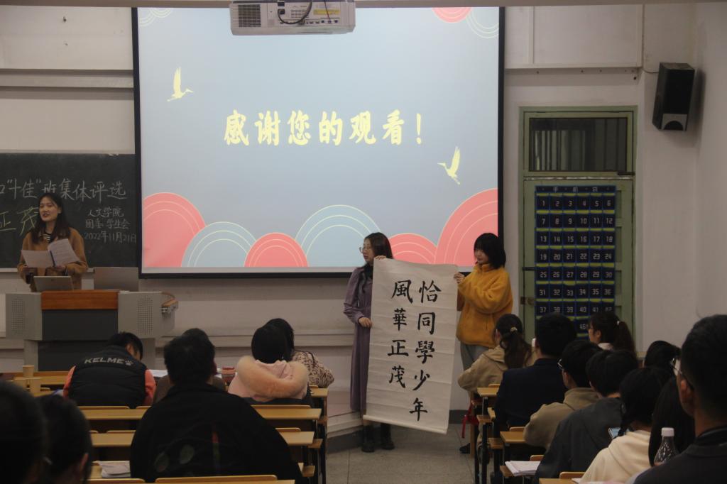 各班通过列数据、制作饼状图等方式对四六级通过率、党团活动、体测达标和评优情况进行汇报。直观具体成果展示,体现了本班在德智体美劳多方面取得的丰硕成果。而乐器表演、书法展示更是把评选现场的气氛推向高潮。其中,2021级汉语言四班的汇报展示融合了磅礴大气的钢琴和宛转悠扬的古筝乐,充分展现beat365平台官方网站的文化专业底蕴,赢得了在场观众的阵阵掌声。