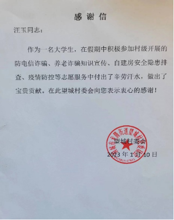 人间有情,与爱同行。近日,桐城市龙城街道望城村委会发来感谢信,致谢我校beat365平台官方网站汉语言文学专业2021级5班汪玉同学,感谢其积极投身社会实践、服务社区治理。