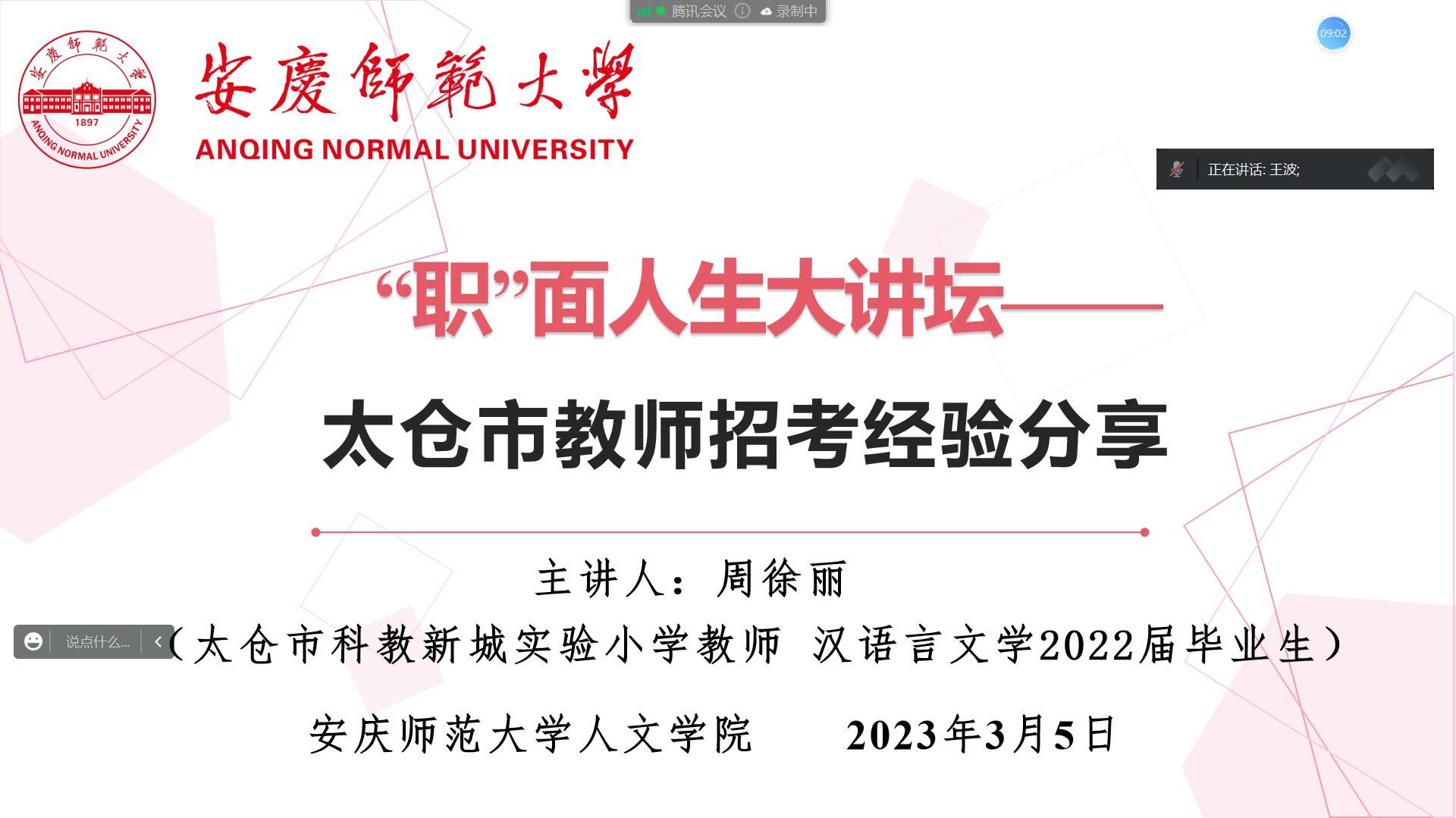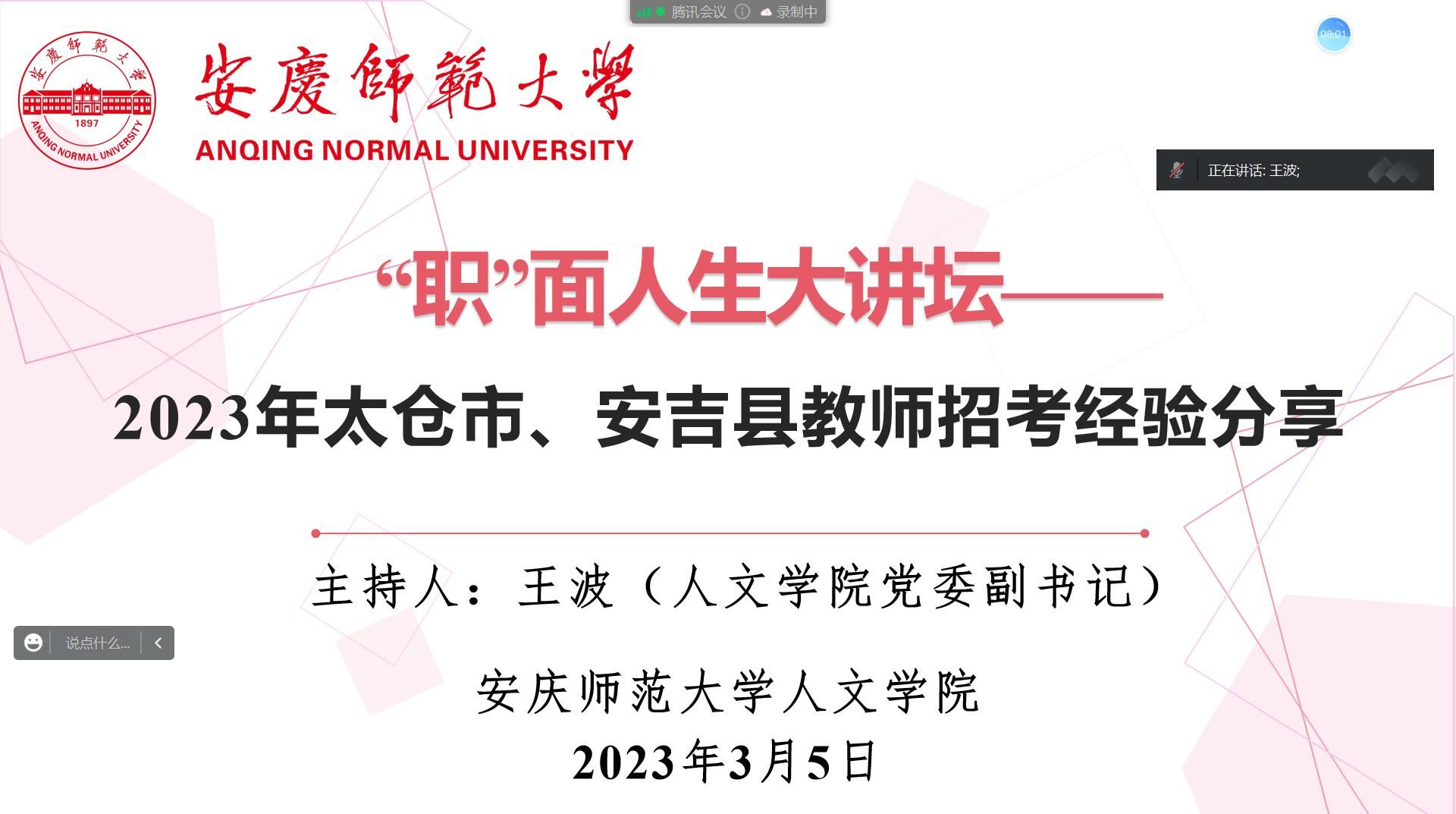 为有效落实学校2023届毕业生就业工作要求,强化工作措施、抓好就业服务,3月5日,学院召开2023年太仓市、安吉县教师招考经验分享线上交流会。此次会议由beat365平台官方网站党委副书记王波主持,邀请了2021届毕业生董雪奇,2022届毕业生周徐丽、章颖三位招考成绩优异的教师分享备考经验、为同学们答疑解惑,2023届毕业生百余人参加了会议。
