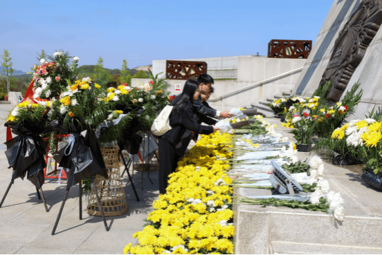 在烈士纪念碑前,全体成员举行了庄严肃穆的悼念仪式。大家列队肃立,齐唱国歌,面对烈士雕塑敬礼鞠躬、深情默哀。三名学生代表神情庄重,怀着对革命先烈的无限哀思与深切敬意,献上鲜花,表达对革命先烈的景仰之情。
