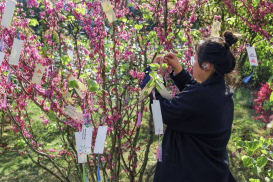 “一张书签寄哀思,缅怀英烈不朽功绩。”在烈士墓旁的小径上,学生们领取陵园提供的特色书签,写下对革命烈士们的寄语,悬挂在径边树梢上,形成一道独特的风景。同学们纷纷表示,采用书签寄语的方式追忆革命先驱,不仅形式新颖,而且还大家搭建了直接表达情感的平台。