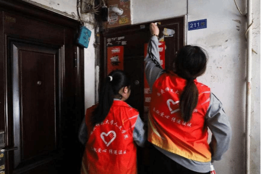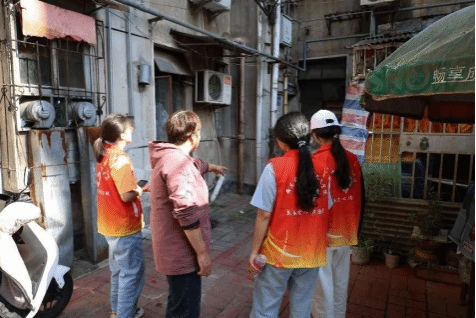 在高花社区工作人员的带领下,青年突击队的六名队员两两分组,对社区内的两栋居民楼进行卫生检查与清理。志愿者们拿好扫帚和簸箕,互相协作,清理楼道各角落的垃圾纸屑、并清除墙面张贴的“牛皮癣”,改善社区环境。清扫的同时,队员们还向附近居民宣传卫生知识,增强居民环保意识。