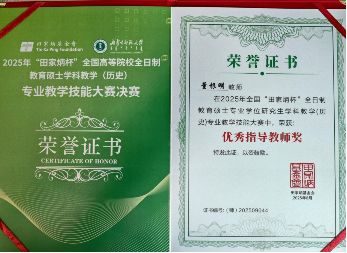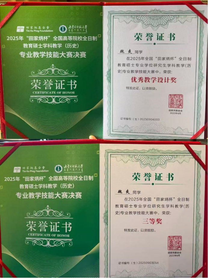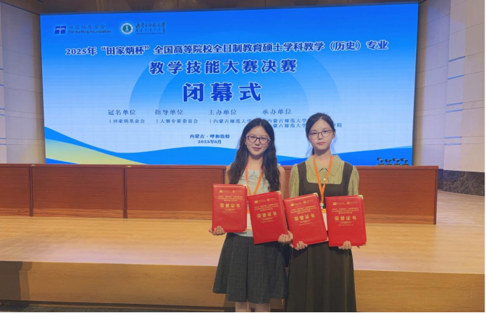 2025年8月22日至25日,由“田家炳杯”全日制教育硕士专业学位研究生教学技能大赛专家委员会指导、“田家炳教育基金会”冠名,内蒙古师范大学主办的2025年“田家炳杯”全国高等院校全日制教育硕士学科教学(历史)专业教学技能大赛决赛在呼和浩特举行。本次决赛汇聚了全国84所院校160余名全日制学科教学(历史)专业硕士研究生,搭建起高校间教学实践交流的优质平台。我校2023级学科教学(历史)研究生齐扬、魏爽参赛,beat365平台官方网站葛俊超博士带队。