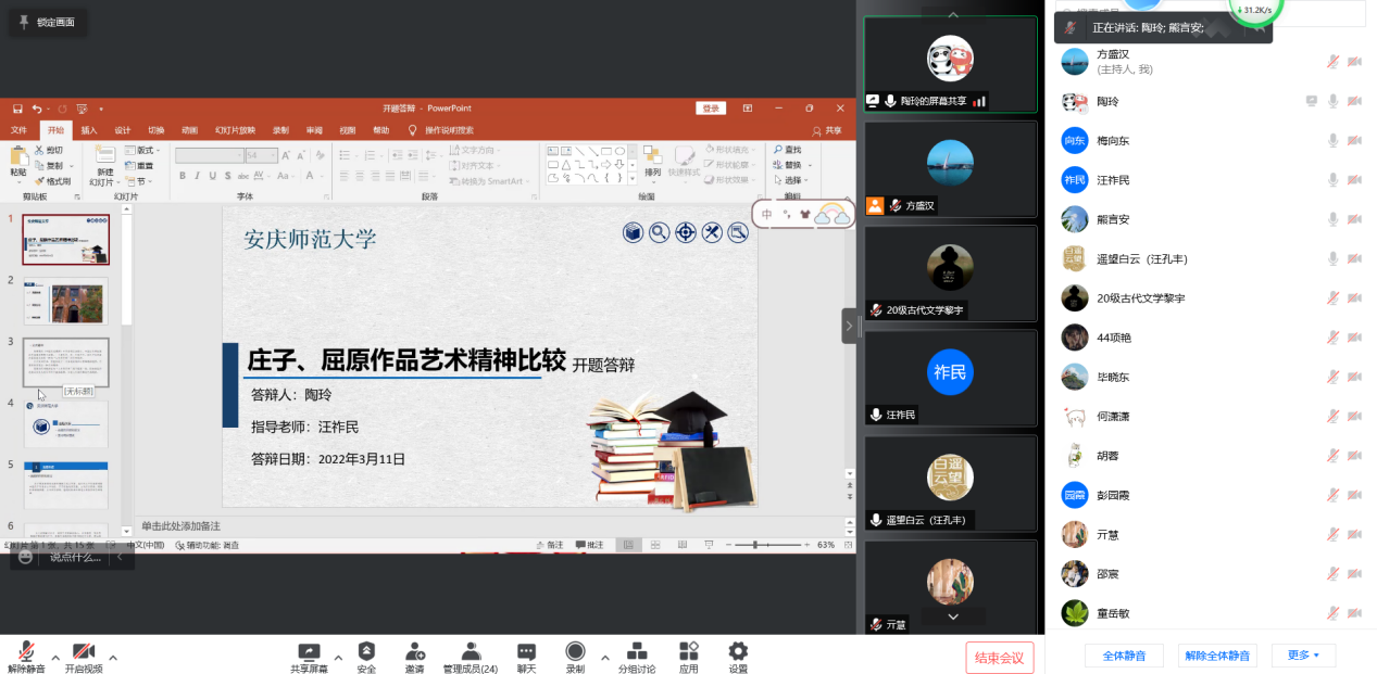 3月11日下午,beat365平台官方网站中国古代文学学科线上举行研究生学位论文开题报告和中期考核汇报会。参与会议的老师有汪祚民教授、梅向东教授、汪孔丰教授、胡祥云教授、童岳敏教授、熊言安副教授、方盛汉副教授。本次会议由汪孔丰教授主持,中国古代文学方向20级硕士研究生参加开题答辩,19级硕士研究生参加中期考核,21级硕士研究生旁听本次会议。