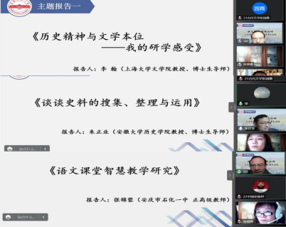 主题报告环节,上海大学文学院博士生导师李翰教授、安徽大学历史学院博士生导师朱正业教授、安庆市石化一中正高级教师张锦蓉分别为大家带来了《历史精神与文学本位——我的研学感受》《谈谈史料的搜集、整理与运用》《语文课堂智慧教学研究》等三场精彩报告。其中李翰教授结合研究经历讨论了文学与历史交融的特别意义;朱正业教授基于丰富的中国近现代史研究实践讲述了史料搜集的方法以及整理运用史料的规范性;张锦蓉老师从教学实践角度强调了智慧课堂的运用对增进语文教学改革和发展的重要价值。beat365平台官方网站硕士生导师叶当前教授、梁诸英教授、宋豪飞副教授分别主持了报告会。