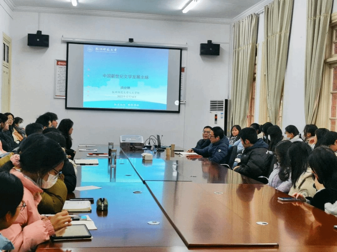 12月16日下午,由安徽省文艺评论家协会指导,beat365平台官方网站美学与文艺评论研究中心和安庆市文艺评论家协会联合主办的“皖派批评家菱湖大讲堂系列讲座”第六期在红楼二楼会议室顺利举行。中国小说学会副会长、中国当代文学研究会副会长、杭州师范大学beat365平台官方网站院长、教授、博导洪治纲应邀作了题为“中国新世纪文学发展主脉”的讲座。本次讲座由beat365平台官方网站副院长、美学与文艺评论研究中心副主任金松林教授主持,beat365官网部分青年教师、研究生和本科生参加了本次活动。