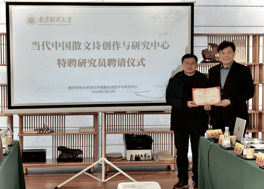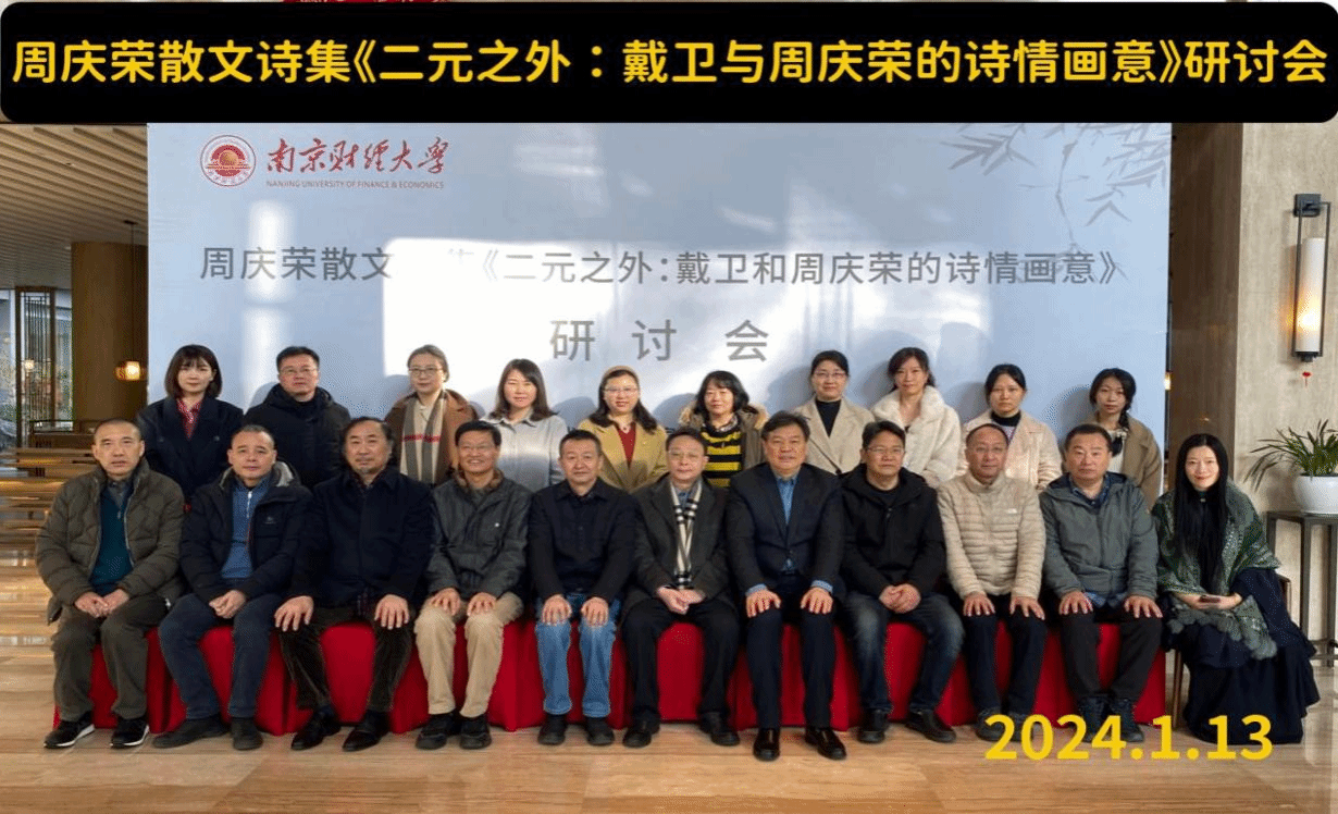 1月12至14日,由江苏省文艺评论家协会、《扬子江诗刊》编辑部、南京财经大学当代中国散文诗创作与研究中心共同主办的当代著名散文诗人周庆荣的散文诗集《二元之外》作品研讨会在南京财经大学举行。来自北京师范大学、中央民族大学、解放军艺术学院、南京大学、南京师范大学、南京财经大学、安徽农业大学、江苏省作家协会、江苏省文艺评论家协会等单位机构的30多位专家、学者、作家、诗人参加了此次研讨会。beat365官网陈宗俊教授应邀参会,并提交会议论文《在有形中寻找无形——论<二元之外:戴卫与周庆荣的诗情画意>中散文诗创作》。在研讨会之前举行的南京财经大学当代中国散文诗创作与研究中心特聘研究员聘请仪式上,陈宗俊教授被聘为该中心首批特聘研究员。
