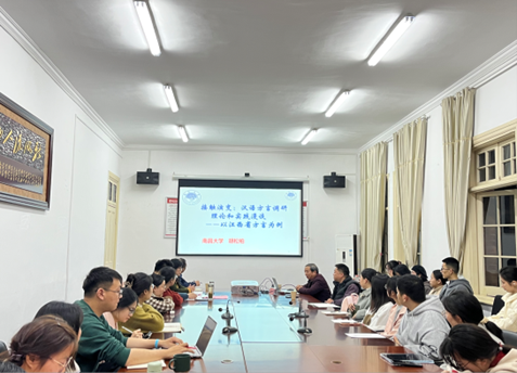胡松柏教授首先从江西四通八达的地理位置解释了其方言的复杂多样性,简单介绍了江西的五大方言及其方言接触现象,认为通过接触性方言共有成分,分清方言之间历时和共时的关系,能够理清方言的演化线索。紧接着,他从方言接触的方式和表现、态势和趋势两个方面,具体介绍了江西各方言在语音、词汇和语法上的接触情况,论述了方言在接触中的地位和程度及其特征的消磨、使用的更替、地域的扩张和退缩等。在讲座中,胡教授还结合自己丰富的研究经验对方言调研的问题提供了许多新颖的视角和思路,鼓励在座学生认真治学,学会从调查中发现问题,带着问题去调查,并提醒大家注意方言和文化的连接。讲座结束,胡教授和与会师生进行了深入交流并向中心赠送了方言研究的系列著作。