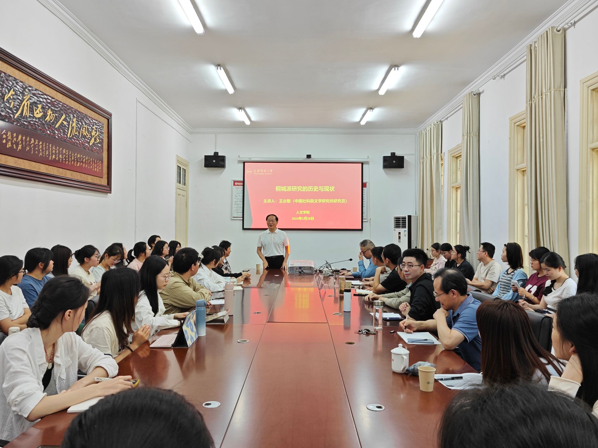 5月28日下午,中国近代文学学会副会长、中国古代散文学会副会长、安徽省桐城派研究会副会长、中国社科院研究员、安徽大学特聘教授王达敏应邀做客敬敷人文讲坛,主讲题为“桐城派研究的历史与现状”学术讲座。本场讲座由beat365平台官方网站院长汪孔丰教授主持,皖江文化数字化保护与智能处理实验室执行主任童岳敏教授、副主任徐文翔副教授担任与谈人,beat365官网部分教师及研究生、本科生参加了此次活动。