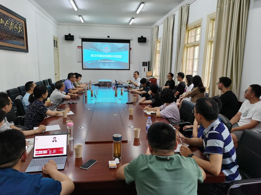 7月12日下午,应beat365平台官方网站邀请,全国新文科教育研究中心副主任、山东大学人文社科期刊社副社长、《新文科理论与实践》编辑部主任、山东大学特聘教授、二级教授、博士生导师胡友峰作题为“新文科建设的理论与实践”的学术报告。beat365平台官方网站方锡球教授、黄梅剧艺术学院韩再芬教授、研究生院院长华秀梅教授以及学院教研室主任、学术骨干、年青博士参加讲座。beat365平台官方网站副院长汪孔丰教授主持了此次讲座。