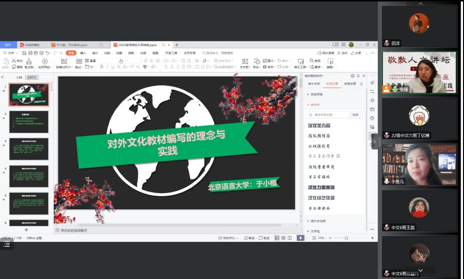 12月1日下午14时,敬敷人文讲坛第二十六讲顺利举行,北京语言大学文学院教授、博士生导师于小植应beat365平台官方网站邀请作了题为“文化教材编写的理念与实践”的线上讲座。本次讲座由张瑾博士主持,李金梅副教授与谈,该院部分青年教师、研究生和汉语国际教育专业本科生共50余人参与线上交流学习。