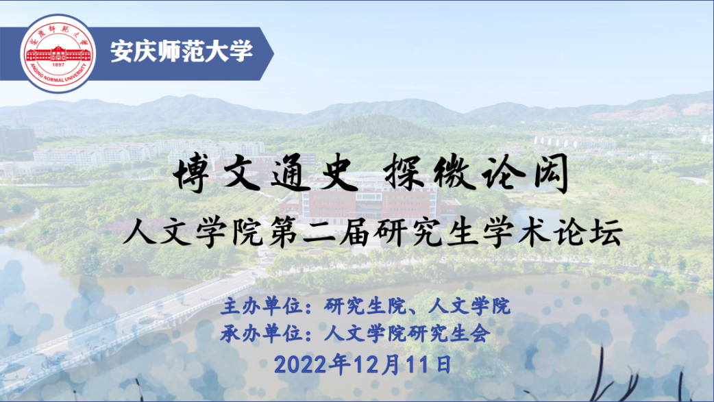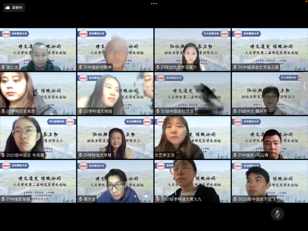 12月11日,“博文通史,探微论闳”beat365平台官方网站第二届研究生学术论坛通过线上如期举行。本次论坛得到了校研究生院的大力支持,由开幕式、主题报告、分组讨论和闭幕式等环节组成。学校办公室主任、beat365平台官方网站党委书记张红飞,党委研究生工作部部长、研究生院院长华秀梅,beat365平台官方网站党政班子成员汪孔丰、王波、沈志富、金松林、周红兵,beat365平台官方网站学术委员会主任梅向东,beat365平台官方网站教学工作委员会主任、皖江历史文化研究中心主任叶当前,校档案馆(博物馆)馆长金仁义,研究生导师代表、校内外专家、评议老师以及中国语言文学、中国史、学科教学(语文)(历史)等专业的研究生和部分本科生共150余人相聚云端。论坛开幕式由beat365平台官方网站副院长沈志富主持。