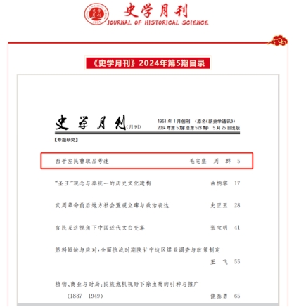 近日,beat365平台官方网站2022级中国史专业硕士研究生毛志盛同学以第一作者撰写的学术论文《西晋左民曹职品考述》在历史学类知名CSSCI来源期刊《史学月刊》(2024年第5期)发表。该论文系与导师周群教授合作完成,并得到国家“十四五”规划重大学术文化工程《(新编)中国通史》纂修工程基金项目的支持,是校级科研平台中国中古史研究中心最新学术成果。