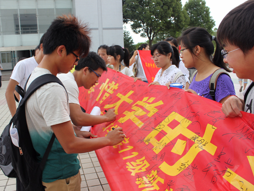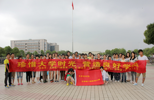 5月31日清晨,在文学院团总支指导下,由2011级新闻学2班主办,新闻学1班、对外汉语1、2班协办的“珍惜大学时光,营造良好学风”主题签名活动在文源楼前敬敷广场举行。