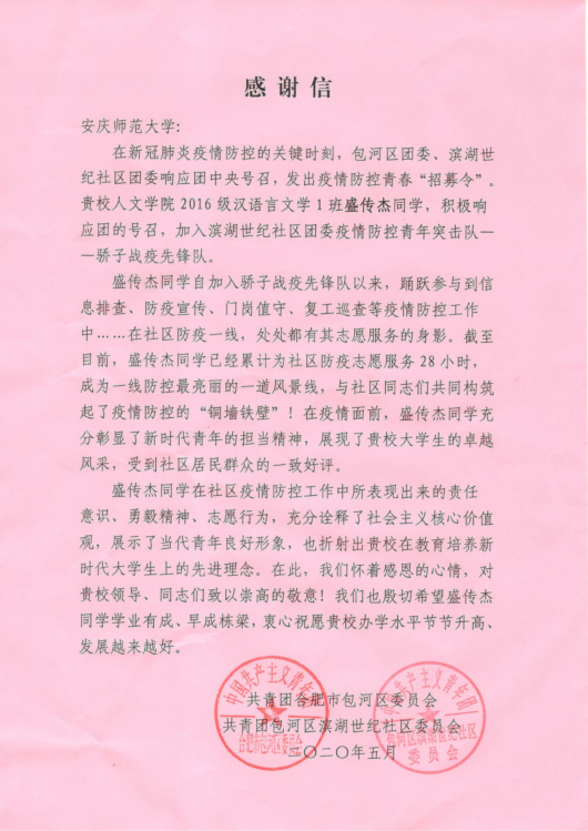 “盛传杰主动加入社区战役先锋队,在工作中展示了当代青年良好形象,也折射出贵校培养新时代大学生的先进教育理念……”6月15日,beat365平台官方网站团委收到一封来自合肥市包河区滨湖世纪社区服务中心的感谢信。信中介绍了盛传杰同学的抗疫事迹,称赞他的责任与担当,肯定beat365平台官方网站的人才培养理念,字里行间流露出真挚的感谢。不止盛传杰,在学院团委的积极号召下,疫情期间还有许多有担当的青年志愿者涌现,他们用行动向社会展现了安庆师大学生的风采。