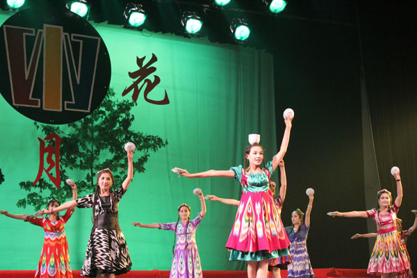 富有民族特色的新疆舞蹈是今年“五月花”晚会的一道亮丽风景,这是由13名新疆班学员表演的。她们身着鲜艳的民族服装,头顶瓷碗,手持盘碟,中指上佩戴的顶针敲打着碟子,发出悦耳的哒哒声。来自边疆的风情让观众们眼前一亮,场上掌声雷动。