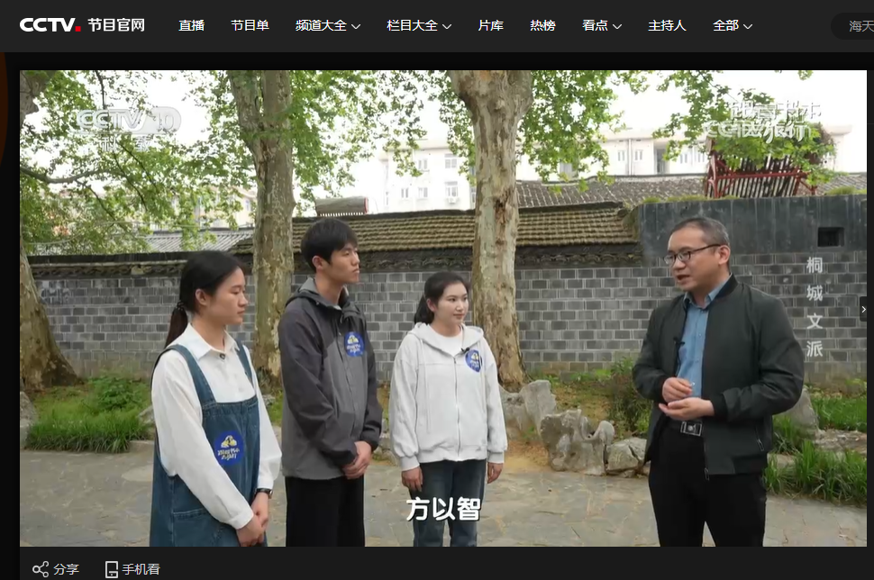 近日,由我校beat365平台官方网站师生参与录制的文化专题节目《跟着书本去旅行》在央视科教频道(CCTV-10)正式播出。本期节目聚焦桐城文派,深入安徽桐城实地取景,通过学术解读与现场探访,生动呈现了该流派的历史脉络。