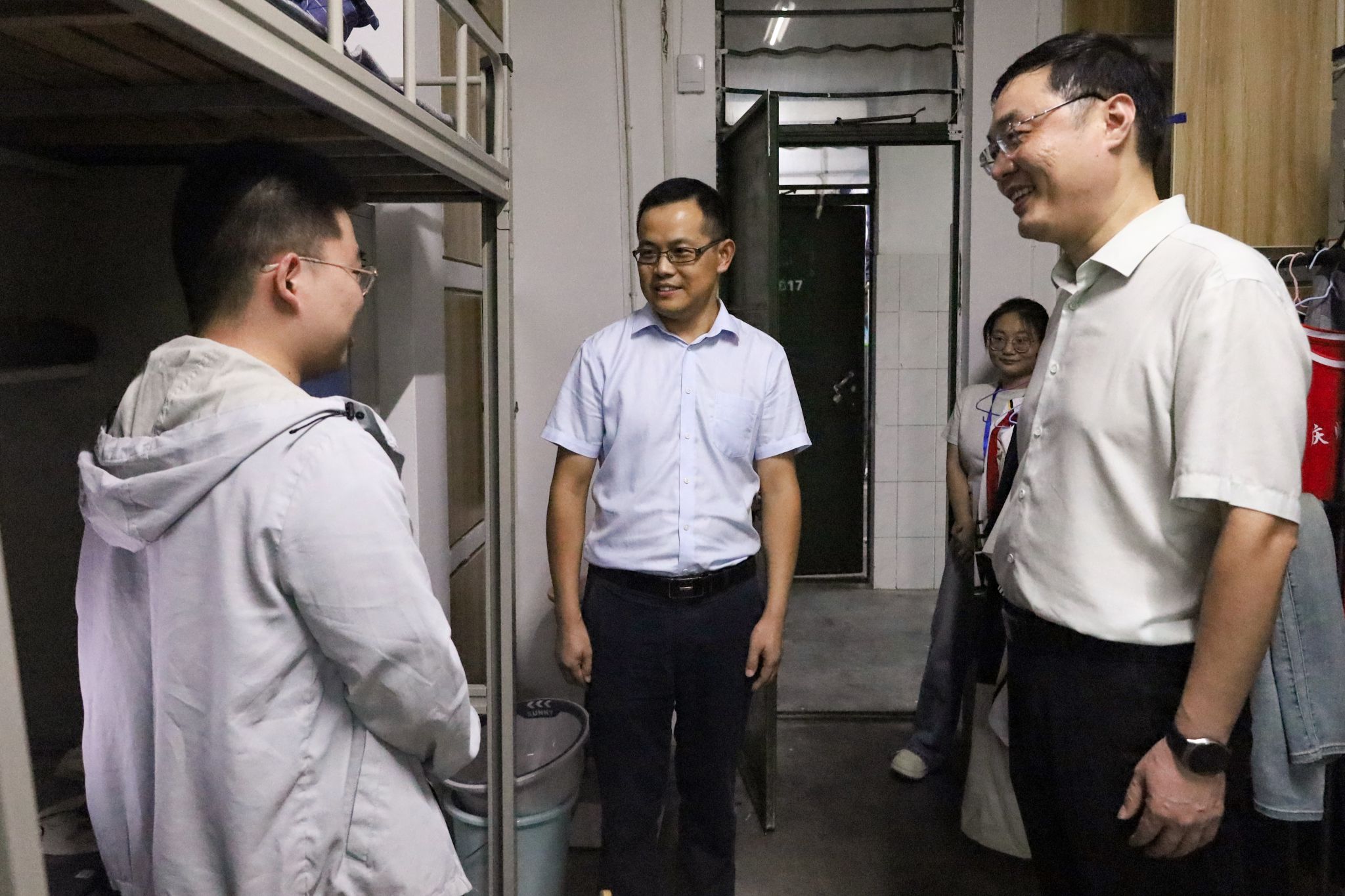 走访过程中,王波一行仔细查看了宿舍环境,与新生们进行了亲切交流,细致地询问同学们的入学感受及适应情况,耐心倾听同学们初入大学的所思所感,并就大家关心的专业学习、校园生活、未来发展等问题给予了初步解答和积极引导,并勉励同学们,要尽快完成角色转变,做好学业规划。