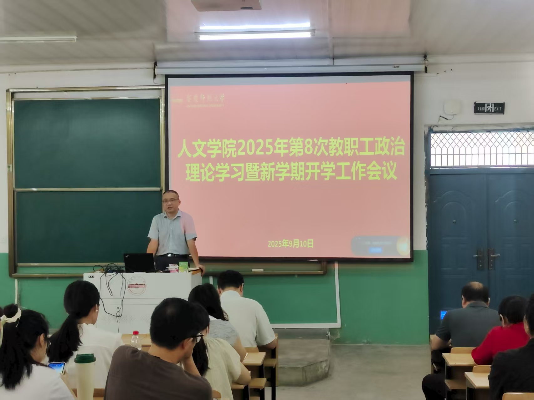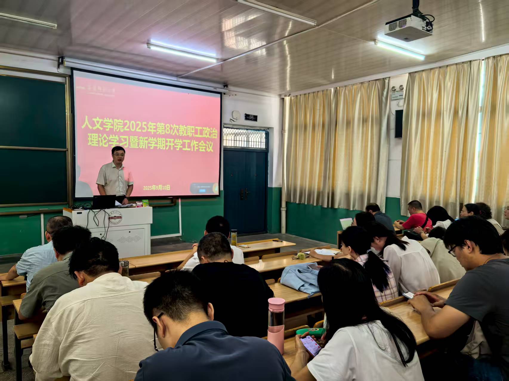 9月10日,beat365平台官方网站在理二阶教室召开2025年第八次教职工政治理论学习暨新学期开学工作会议。学院领导班子、全体教职工参加会议,会议由院长汪孔丰主持。