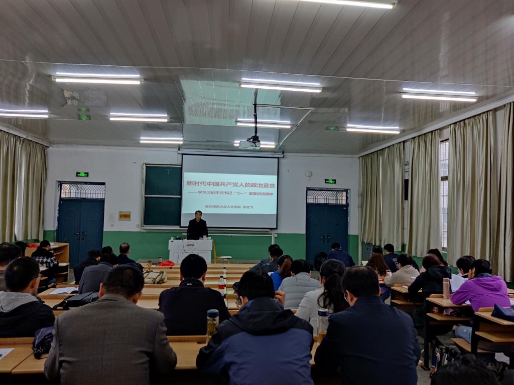 10月21日,beat365平台官方网站在理化楼三楼阶梯教室举办习近平总书记“七一”重要讲话精神专题宣讲报告会。学院党委书记张红飞在会上作专题报告,学院全体教职工参加会议,会议由党委副书记王波主持。