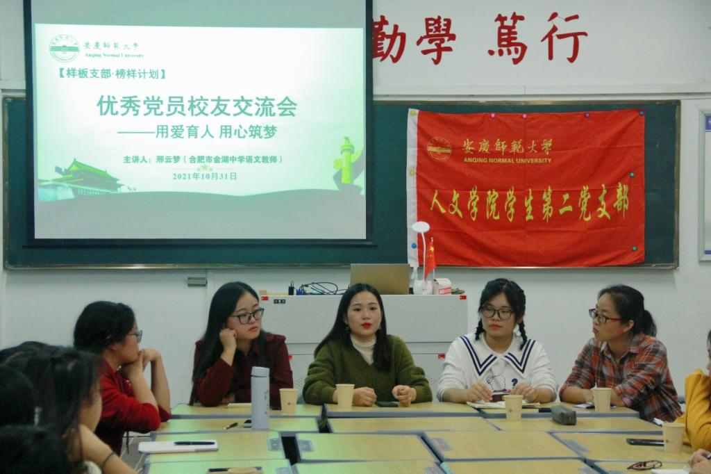 为做好优秀党员校友与在校学生党员“传帮带”工作,以榜样力量引领实际行动,更好地发挥党员先锋模范作用,10月31日晚,支部2018届优秀党员校友、合肥市金湖中学语文教师邢云梦与支部党员、发展对象相聚一堂,共话一名人民教师的成长之路。