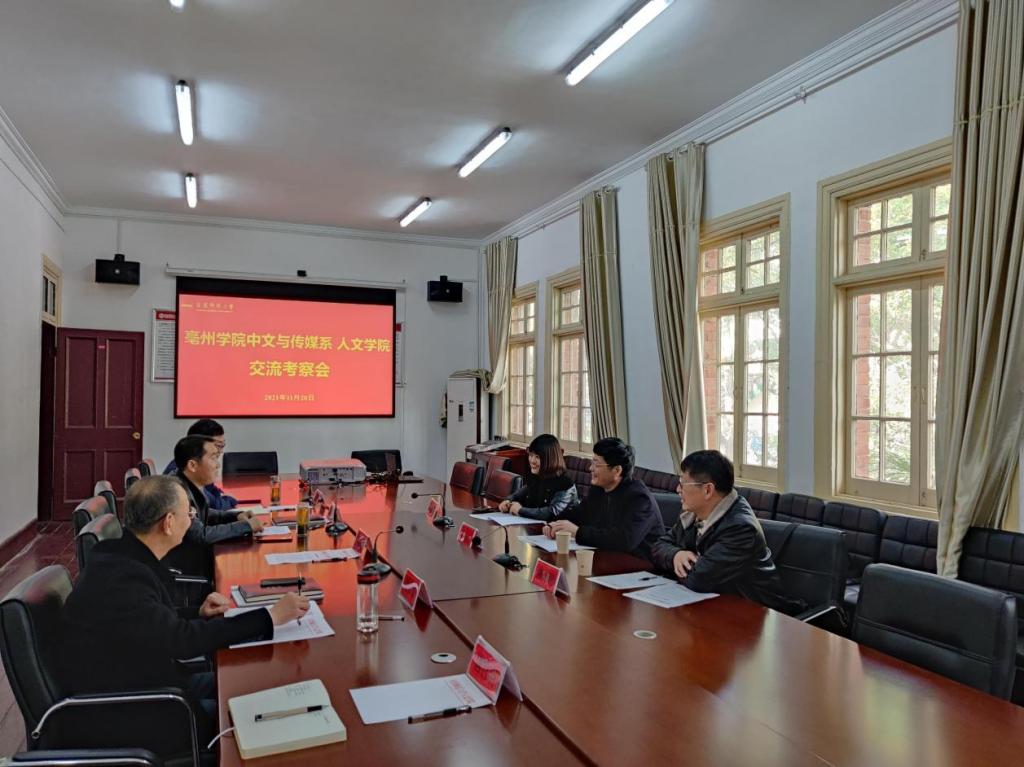 11月20日,亳州学院中文与传媒系系主任谢启平等一行到beat365官网考察交流。beat365平台官方网站党委书记张红飞热情接待来宾,副院长金仁义、党委副书记王波参加座谈交流。
