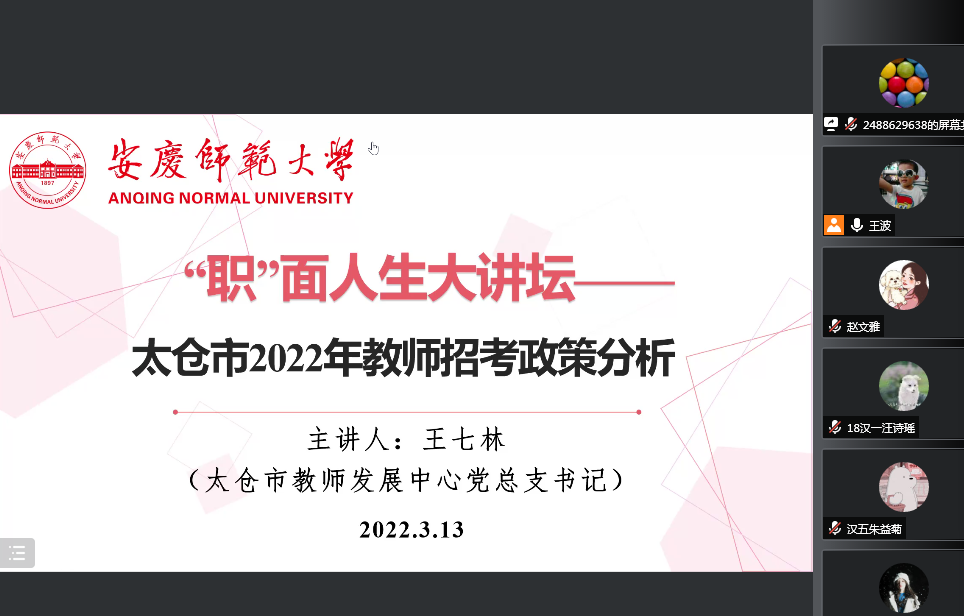 为帮助毕业生科学研判就业形势,树立正确求职理念,3月13日晚,beat365平台官方网站线上举办了2022年江苏省太仓市教师招考考情分析暨教师专业发展经验分享会。太仓市教师发展中心党总支书记王七林,太仓市沙溪镇三小教师、2020届汉语言文学毕业生赵文雅,太仓市双凤中学教师、2021届汉语言文学毕业生郑博文应邀参加。会议由beat365平台官方网站党委副书记王波主持,2018级、2019级部分学生近两百人线上聆听学习。