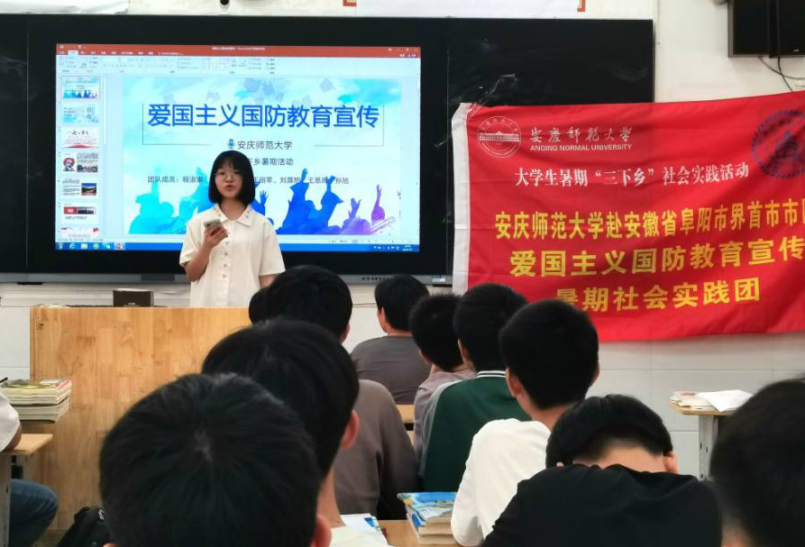 学校是开展全民国防教育的重要阵地。7月7日,调研实践团来到界首中学开展爱国主义教育和国防教育宣讲。宣讲当日恰逢“七七事变”85周年,队员带领中学生们重温85年前的悲痛硝烟,追悼英勇顽强的爱国忠烈,共同宣誓“勿忘国耻,警钟长鸣”,由此强调国防事业建设和国防教育对于国家发展和人民幸福的重要作用。通过对比叙利亚等国家与中国国防事业的发展,实践团成员呼吁青年学子主动掌握科学文化知识,打造过硬品格,不断增强国防观念,积极参与国防建设。