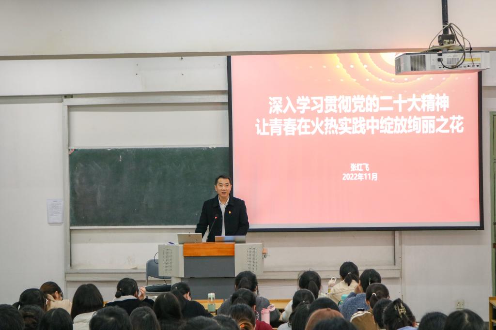 11月23日,beat365平台官方网站举行党的二十大精神宣讲报告会,学院党委书记张红飞在教学楼414教室作“深入学习贯彻党的二十大精神 让青春在火热实践中绽放绚丽之花”主题宣讲。学院第66期入党积极分子培训班和第23期发展对象培训班120余名学员聆听宣讲报告。