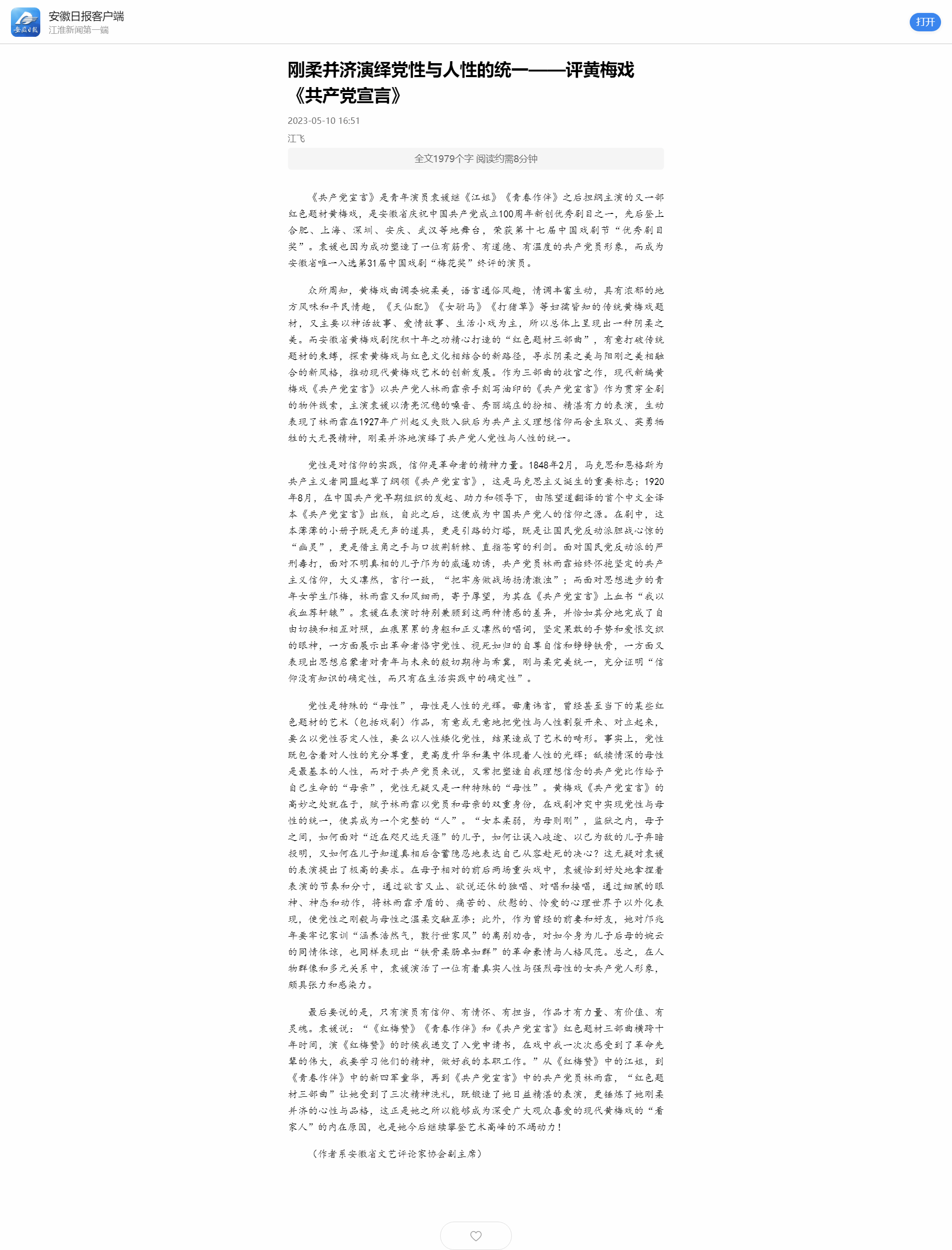 近日,《安徽日报》刊发beat365官网江飞教授撰写的评论文章《刚柔并济演绎党性与人性的统一——评黄梅戏<共产党宣言>》。该文以现代新编黄梅戏《共产党宣言》为例,阐述了现代黄梅戏创作积极探索黄梅戏与红色文化相结合的新路径,积极宣扬作品主人公为共产主义理想信仰而舍生取义、英勇牺牲的大无畏精神,褒扬了主演刚柔并济地演绎了共产党人党性与人性的统一。