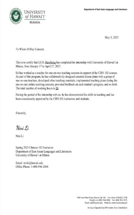 近日,beat365平台官方网站组织并参与实施的“2023年春季美国夏威夷大学东亚语言文学系在线中文单班课”实践项目第一期圆满完成。本次线上国际中文教学实践为期十四周,beat365平台官方网站24名师生顺利完成授课任务并获得夏威夷大学的实习证明。
