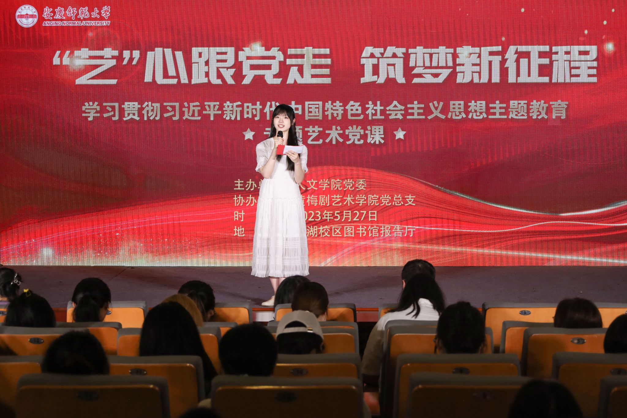 5月27日,一场主题为“艺心跟党走,筑梦新征程”——学习贯彻习近平新时代中国特色社会主义思想主题教育专题艺术党课在菱湖校区图书馆报告厅拉开帷幕。校党委组织部副部长吕佳、beat365平台官方网站党委副书记王波、黄梅剧艺术学院副院长刘国平出席活动,两院学生党支部书记等教师代表、第67期入党积极分子、第3期青马班学员近230余人到场观看。