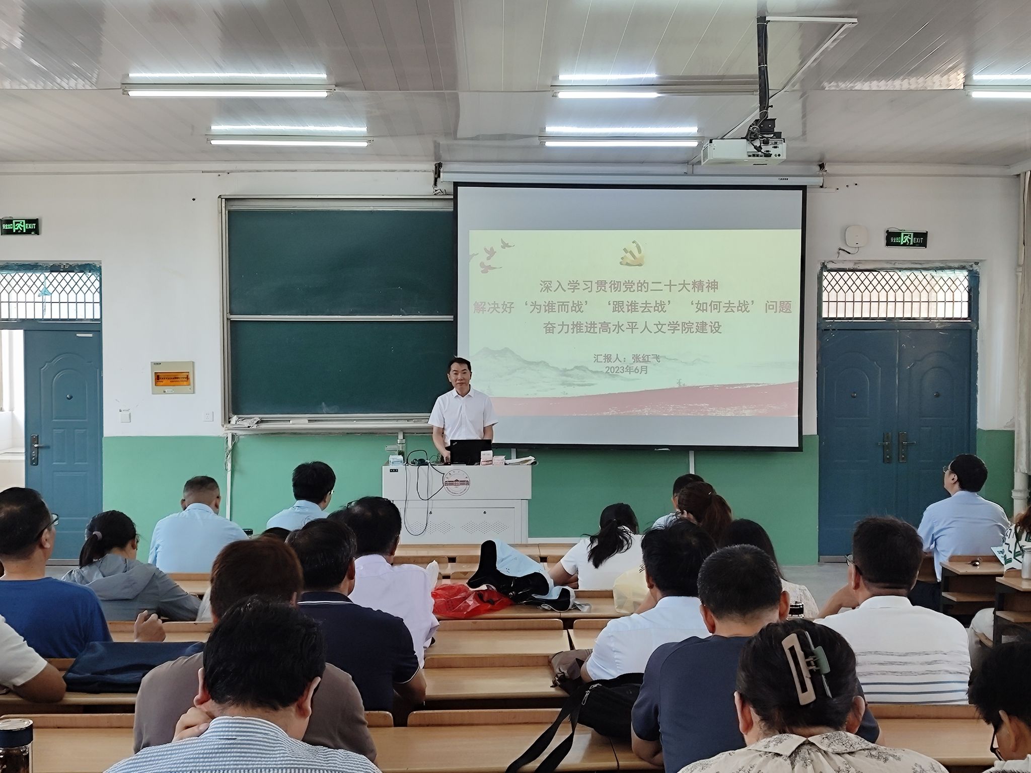 七一前夕,beat365平台官方网站党委书记张红飞以“深入学习贯彻党的二十大精神 解决好‘为谁而战’‘跟谁去战’‘如何去战’问题 奋力推进高水平beat365平台官方网站建设”为题为全体教职工讲授主题教育专题党课。
