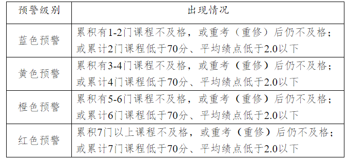 第三条 学业预警分为蓝色、黄色、橙色、红色四个等级。学业预警工作按学期进行,每学期开学后四周内由学院根据学生学业情况建立相应的预警档案并发出预警通知单。