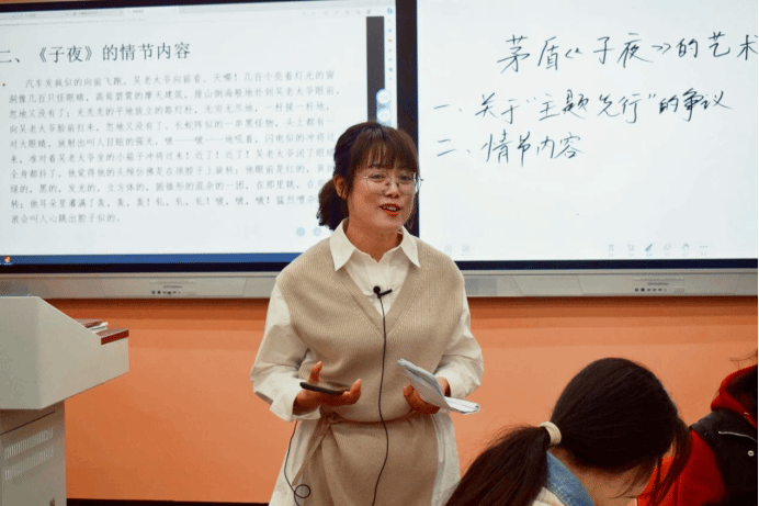 冯慧敏老师以“关于《子夜》‘主题先行’的争议”为线索贯穿整个课堂,要求学生解读文本时需秉持科学、客观的态度,引导学生从文本出发探究《子夜》的艺术成就,号召同学们从茅盾的艺术经验中汲取精神力量。冯老师让学生通过朗读段落、细读文本以及对比分析等方法整体把握《子夜》的情节内容,并从题材主题、结构艺术、人物形象、心理刻画、小说语言等方面细致阐明了《子夜》的艺术成就,在此基础上,她明确指出茅盾创作构思上的“主题先行”并不妨碍《子夜》的艺术价值。冯老师引导学生关注茅盾创作之所以成功的原因在于:一是《子夜》的主题出自他对30年代中国社会政治经济状况的独立思考;二是创作过程中茅盾深入体验生活,积累了丰富的创作素材;三是作家长期从事编辑工作,具有扎实的理论功底和卓越的艺术素养。最后,冯老师引用习近平总书记在中国文联十一大、中国作协十大开幕式上的讲话,启发同学们从茅盾创作中感悟创作真谛,踏实学习,注重实践,独立思考,用心写作,争做能够讲好中国故事的时代青年。