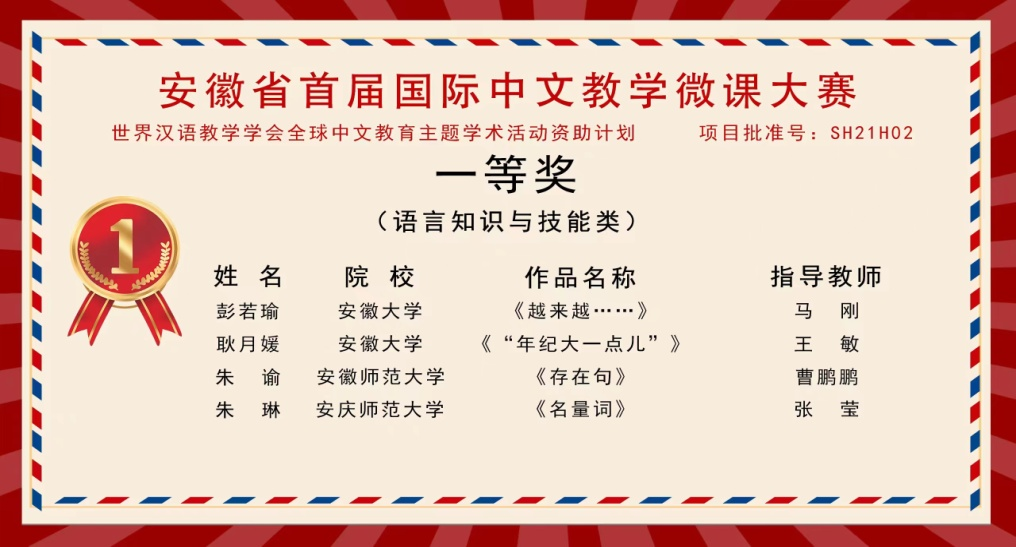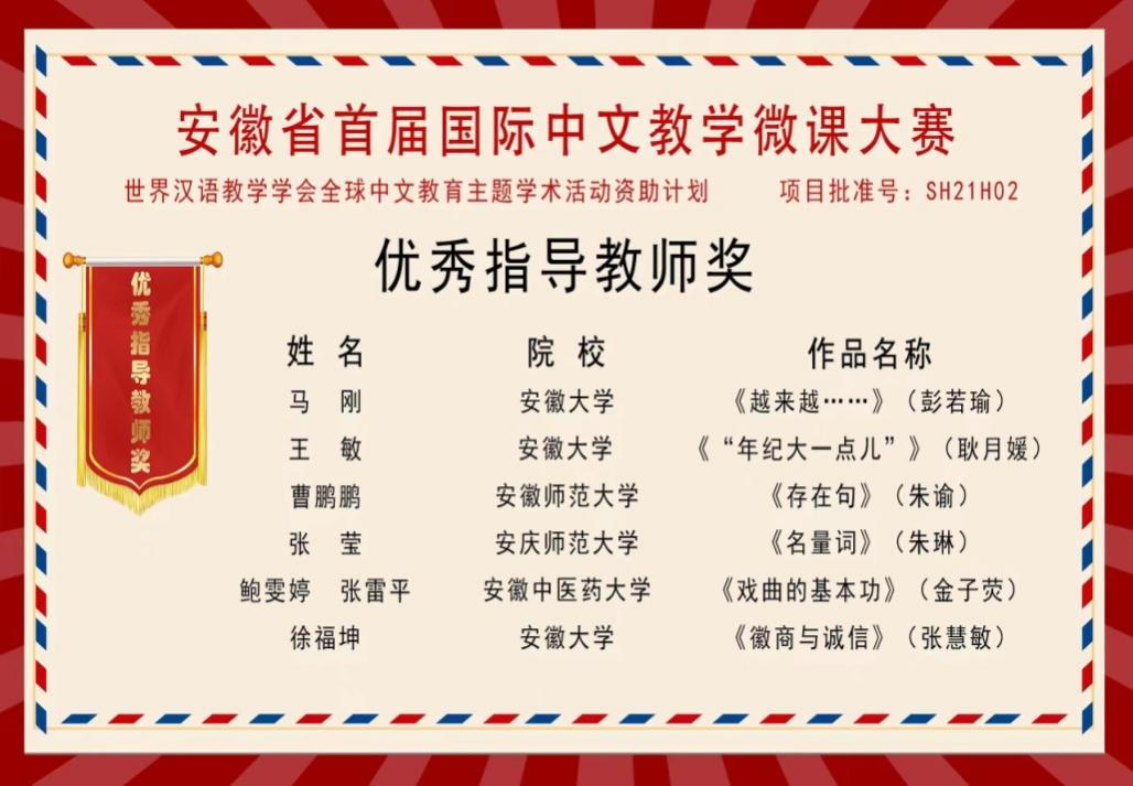 2022年11月20日,由世界汉语教学学会全球中文教育主体学术活动资助、安徽省汉语国际教育研究会主办、安徽大学文学院和安徽农业大学外国语学院承办的安徽省首届国际中文教学微课大赛评选结果揭晓。beat365平台官方网站2019级汉语国际教育专业朱琳同学荣获一等奖;2019级汉语国际教育专业梁嘉越同学、朱慧同学荣获优秀奖;张莹老师荣获优秀指导教师奖。