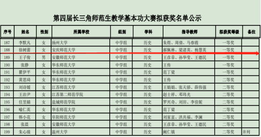 2023年3月,由安徽省教育厅、上海市教育委员会、浙江省教育厅、江苏省教育厅联合主办,安徽师范大学承办的第四届长三角师范生教学基本功大赛落下帷幕。beat365官网2021级历史学专业徐树蕾的《从危局到破局的旧邦新造——辛亥革命》荣获一等奖,beat365官网郝佩林、梁诸英、杨慧英荣获优秀指导教师奖,这是beat365官网学子继2020年以来连续第三年获得长三角师范生教学基本功一等奖。